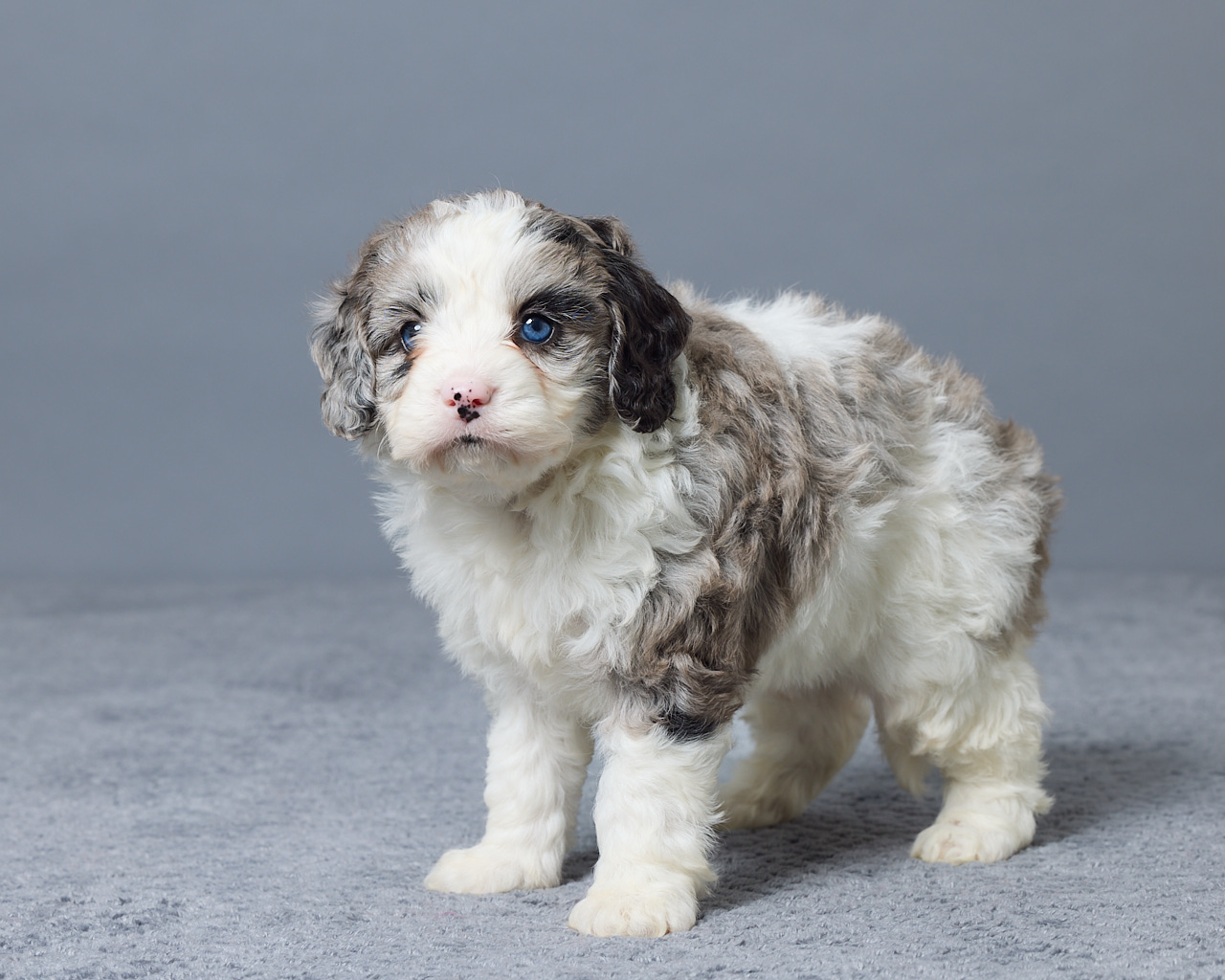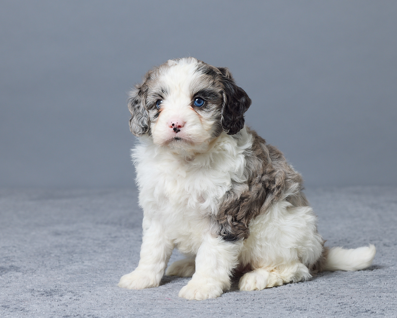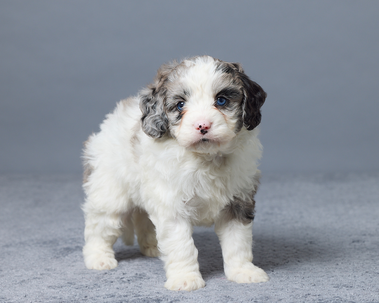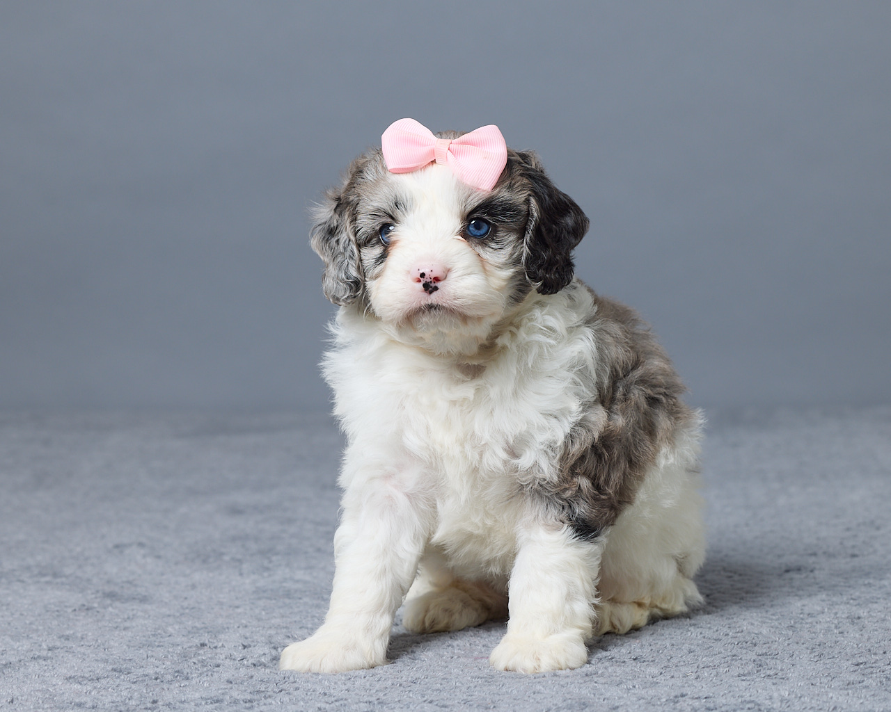 Olina is a gorgeous blue merle and white Mini Bernedoodle that truly stands out. She has a sweet personality and loves attention, making her a wonderful companion. Raised in a family setting, she is well socialized and used to everyday life. Her mom, Rhonda (40 lbs), and dad, Rio (12 lbs), pass down great traits and a nice smaller size. Olina is expected to weigh around 18–25 lbs full grown. She is vet checked and up to date on all her shots and dewormer. And ready to meet her new family.