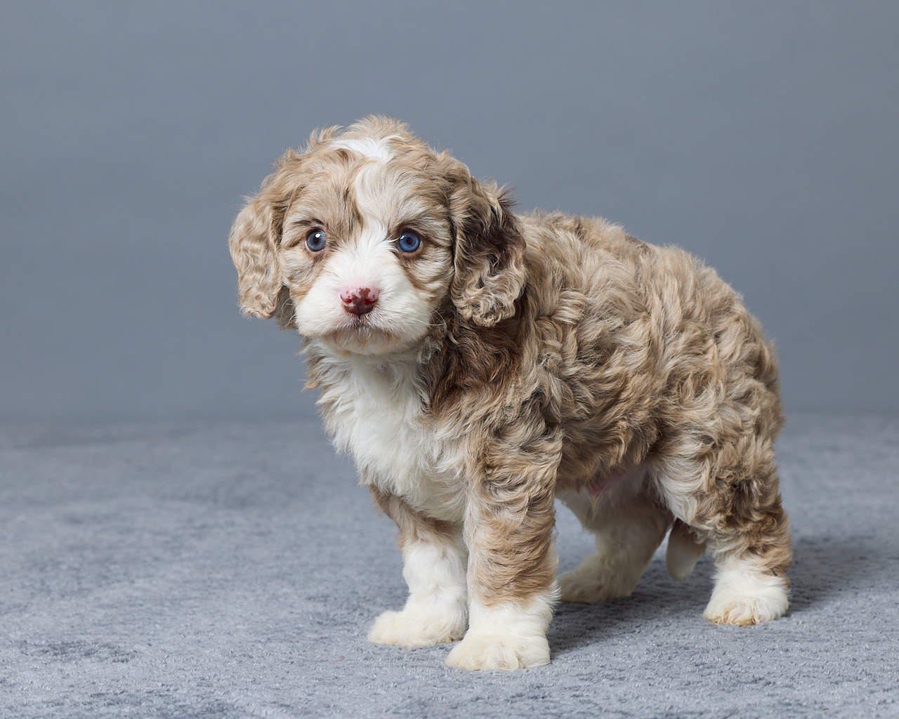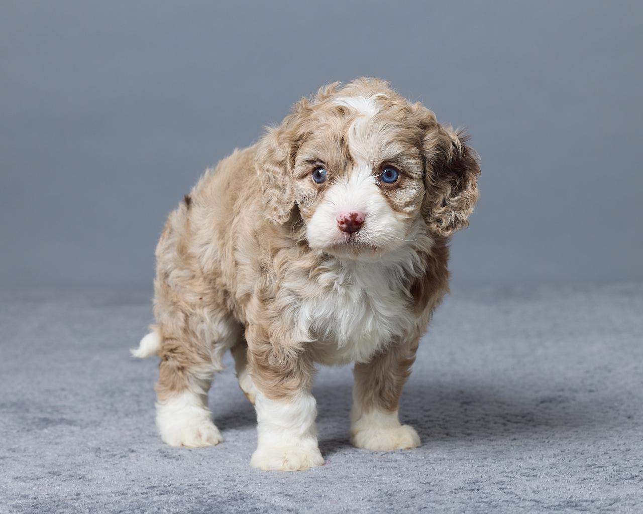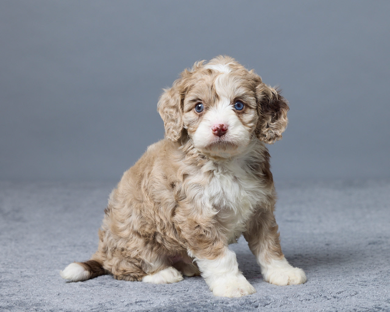 Ollie is a striking chocolate merle and white Mini Bernedoodle with a fun and loving personality. He is family raised and enjoys playtime as well as relaxing by your side. His mom, Rhonda (40 lbs), is gentle and easygoing, while his dad, Rio (12 lbs), adds intelligence and energy. Ollie is expected to weigh around 18–25 lbs full-grown. He is vet checked, up to date on shots and dewormer, and ready for his forever home.